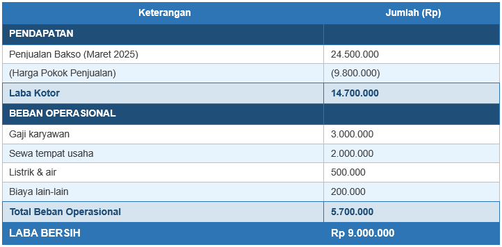 Analisis Margin: Margin laba bersih = Rp 9.000.000 / Rp 24.500.000 = 36,7%. Artinya dari setiap Rp 100.000 penjualan, Pak Rudi membawa pulang sekitar Rp 36.700 sebagai laba bersih.