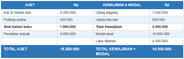 Rumus dasar: Aset = Kewajiban + Modal. Kedua sisi neraca harus selalu sama (balance).