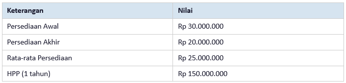 Inventory Turnover = Rp 150.000.000 ÷ Rp 25.000.000 = 6 kali