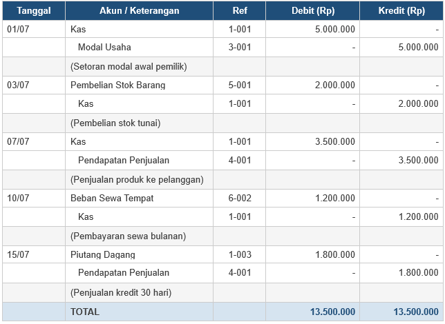 Jurnal umum mencatat semua jenis transaksi dalam satu buku, cocok untuk UMKM yang volume transaksinya belum terlalu tinggi. Format standarnya terdiri dari kolom: tanggal, nama akun, referensi, debit, dan kredit.