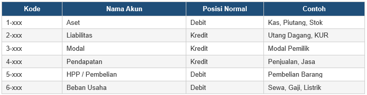 Sebelum membuat jurnal akuntansi keuangan, pelaku UMKM perlu memahami pengelompokan akun dan posisi normalnya. Berikut tabel klasifikasi akun yang umum digunakan: