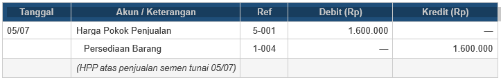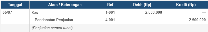 Contoh: Toko Bahan Bangunan menjual semen Rp2.500.000 secara tunai (5 Juli)