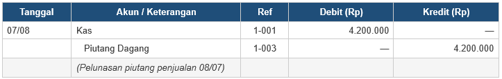 Catatan: Jurnal pelunasan piutang wajib dicatat terpisah. Jika tidak dicatat, saldo piutang di neraca akan menggembung dan tidak mencerminkan kondisi nyata.