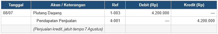 Penjualan kredit terjadi ketika pembayaran ditangguhkan ke kemudian hari. Akun yang terpengaruh adalah Piutang Dagang (debit) dan Pendapatan Penjualan (kredit). Pelunasan piutang dicatat terpisah saat pembayaran diterima.