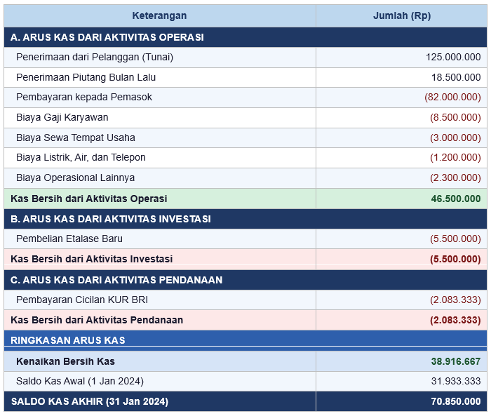 - Kas keluar: Pembayaran cicilan pinjaman, prive (pengambilan modal pemilik)