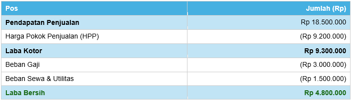 Menampilkan pendapatan dan beban selama satu bulan untuk menghitung laba atau rugi bersih.