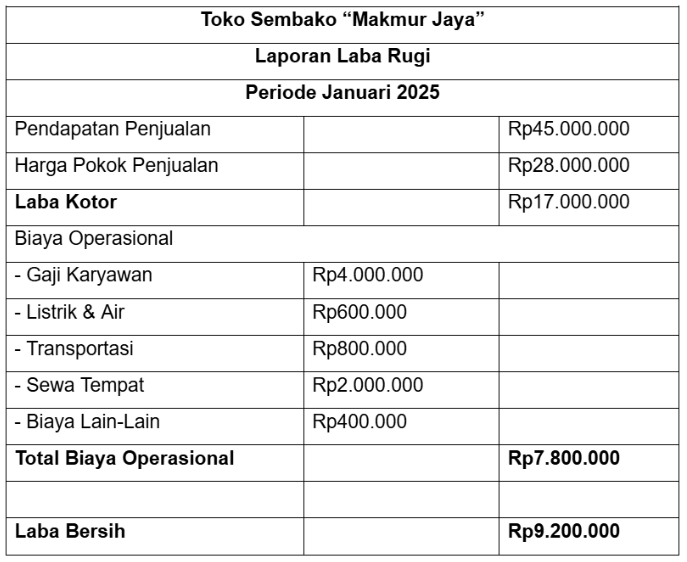 Menunjukkan pendapatan, biaya, dan keuntungan/rugi usaha dalam periode tertentu.