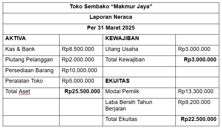 Menunjukkan posisi aset, kewajiban (utang), dan modal pada waktu tertentu.